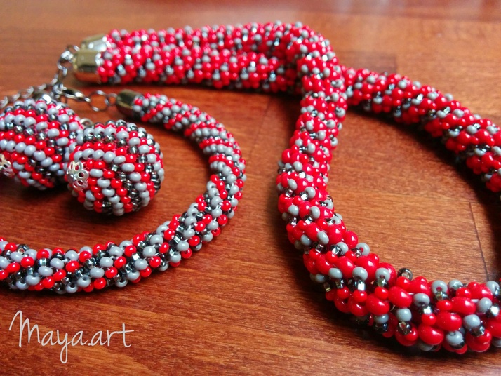 Sada šperků je vyrobena z českého rokajlu červené a šedé barvy technikou šité dutinky.