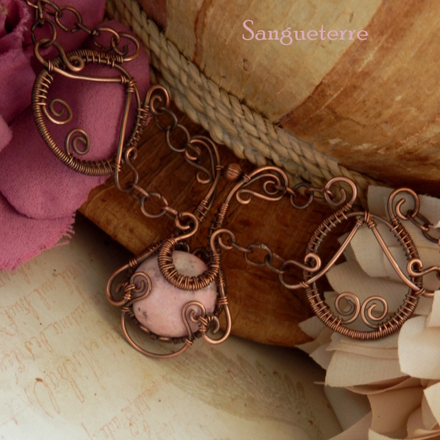 Luxusní, neobvyklý náramek je vyroben jemnou, pečlivou technikou drátkování - wire-wrapping. Zdobí jej především drobný, něžně růžový kabošon rodochrozitu...