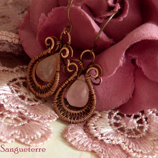 Velmi jemné, něžné náušnice jsou vytvořené starobylou technikou drátkování - wire-wrapping. Kromě jemného vyplétání měděných drátků je zdobí i velké, broušené brioletky růženínu.
