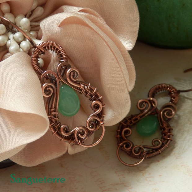 Výrazné, nepřehlédnutelné náušnice zdobí dvě velké, hladké brioletky zářivě zeleného chrysoprasu. Náušničky byly vyrobeny starodávnou, pečlivou technikou drátkování - wire-wrapping.