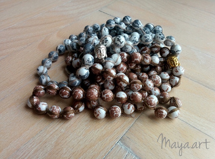 Náhrdelníky vyrobené z korálků a bavlněné příze technikou drhání doplněné o Buddhu.