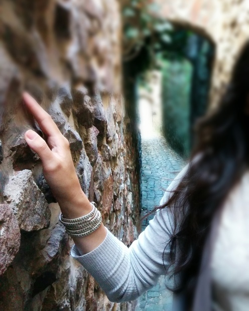 Náramek je vyroben z kožené šňůry a broušených korálků technikou tkaní korálků. Náramek tvoří pět otoček kolem ruky.