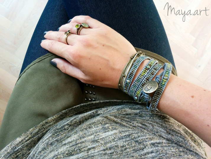 Zápěstí omotané do wrap náramku z šedé kůže a hnědých a zelených korálků. Sadu doplňuje náramek vyrobený z bavlněných šňůr a kovových korálků.