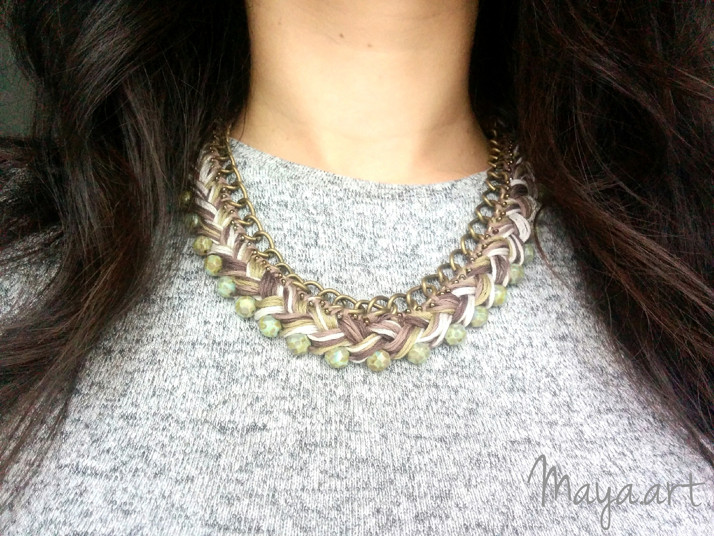 Náhrdelník je vyroben z bavlnek, korálků a řetízku. Základem šperku je spletany copánek z bavlnek našitý na řetízek a dozdobený korálky.
