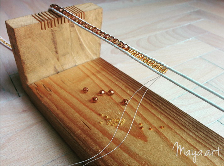 Tkaní náramku na tkalcovské rámu. Náramek je vyroben z bílé kožené šňůry a zlatých broušených korálků a rokajlu.