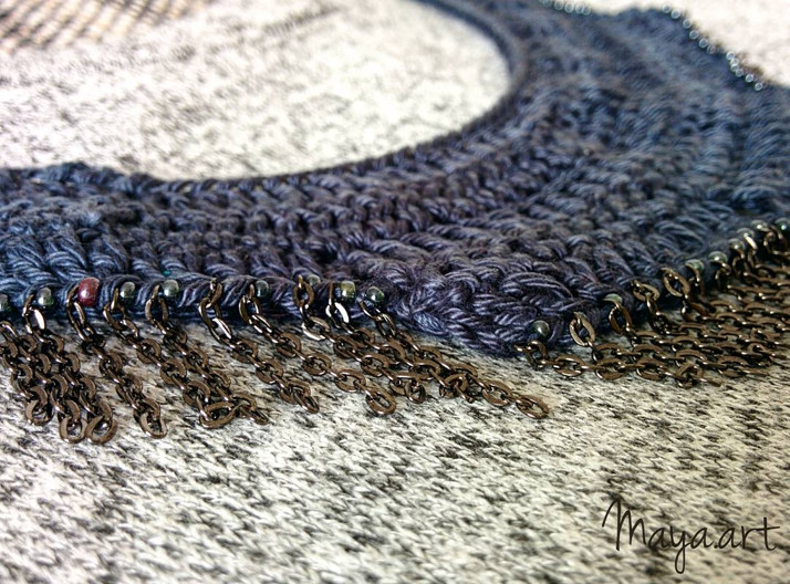 Háčkovaných náhrdelník je vyroben z vlněné příze, rokajlu šedé barvy a starostříbrných řetízků našitých na lem.