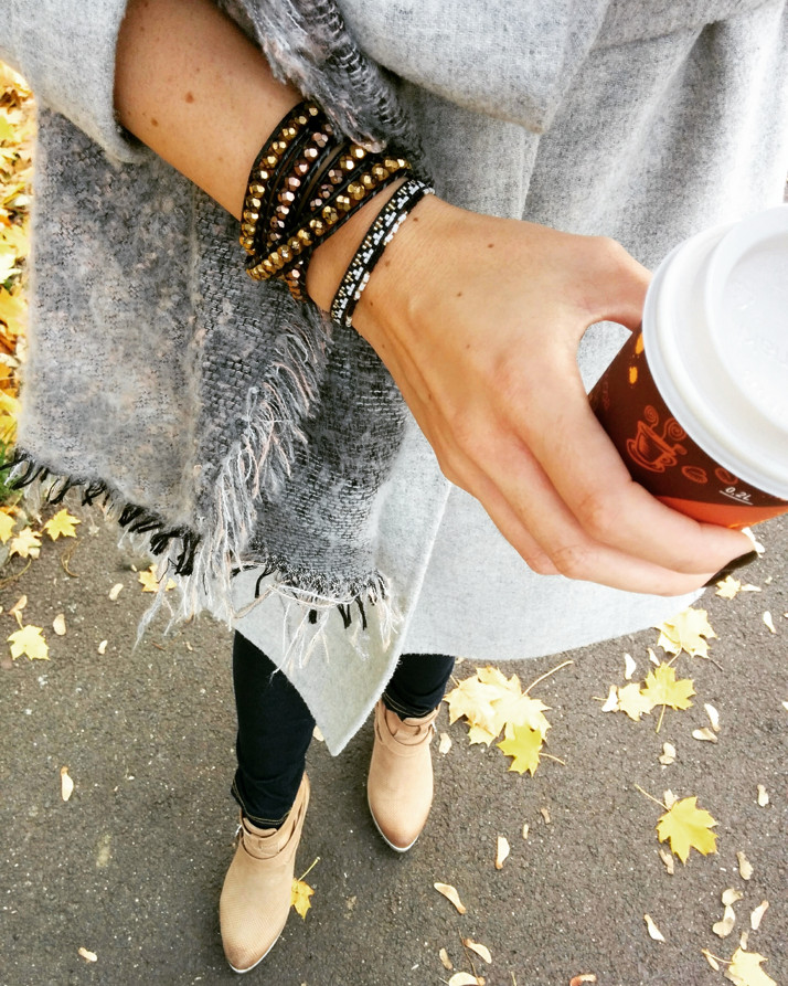 Zápěstí obepnuté Wrap náramkem a tkaným náramkem z rokajlu TOHO. Oba náramky ve zlato-černém provedení.