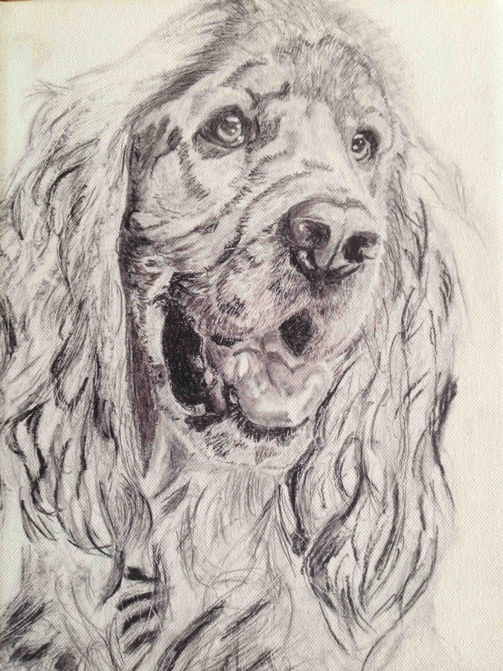 Pejsek mého táty. Maloval jsem ho tužkou a uhlem na plátno