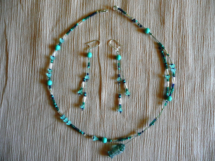 Náhrdelník s rybkou na udici plus náušnice. Vyrobeno ze skleněných korálků.