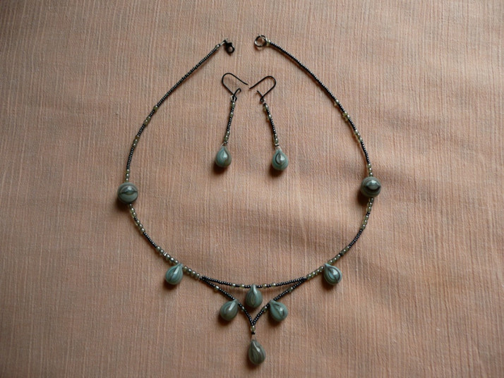 Náhrdelník a náušnice z českých mačkaných korálků v barvě modrošedé.
