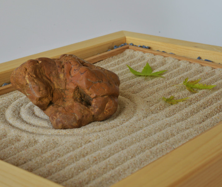 Mini zenová zahrádka o velikosti 40x30 cm. Materiál smrkové dřevo, písek a kámen.