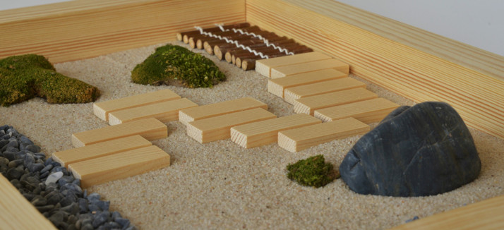 Mini zahrádka o rozměrech 40x30 cm. Materiál smrkové dřevo, písek, kamínky, mech