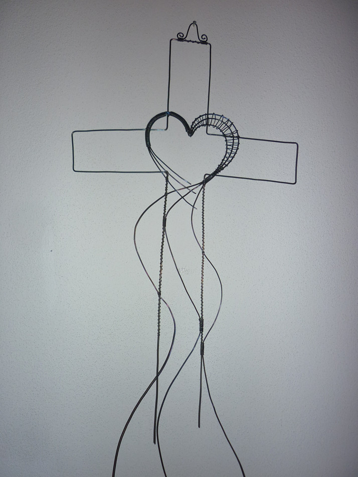 Drátovaný kříž z černého drátu pro brášku do nového bytu, zde v rozpracované podobě