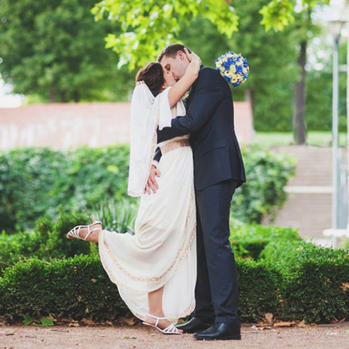 Pavla si objednala model “Precizně zdobené svatební šaty”, ve kterých vypadala jako antická bohyně. Model jsme nechaly v původní podobě (kromě mírného nařasení sukně) a doplnily jej o pléd a závoj se stejným motivem.