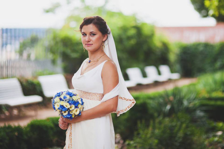 Pavla si objednala model “Precizně zdobené svatební šaty”, ve kterých vypadala jako antická bohyně. Model jsme nechaly v původní podobě (kromě mírného nařasení sukně) a doplnily jej o pléd a závoj se stejným motivem.