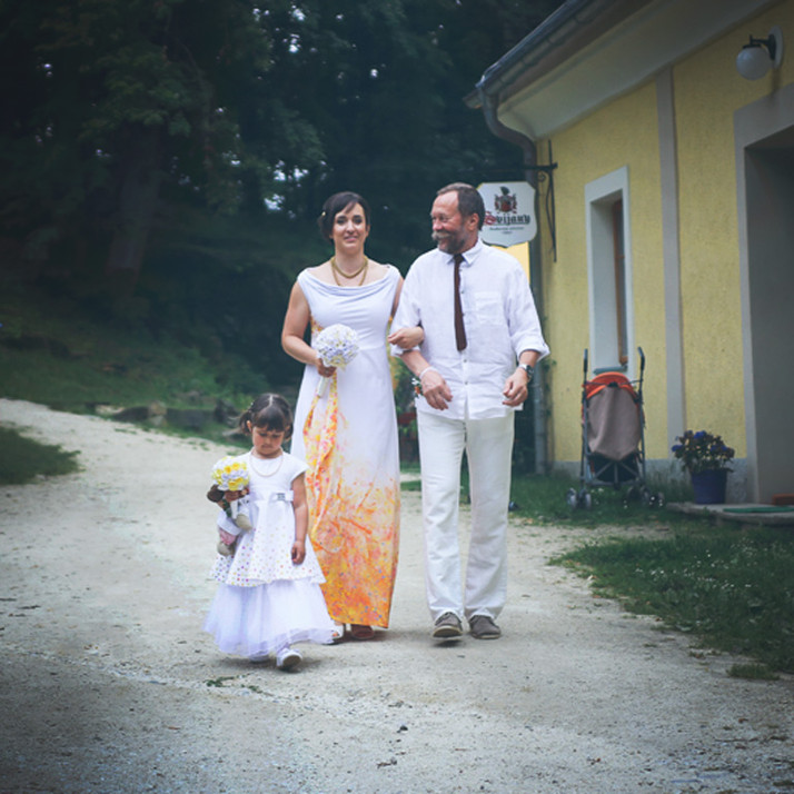 Tyto šaty byly navrženy přímo pro Kateřinu. Společně jsme vymyslely a posléze „dolaďovaly“ střih, vzor i barvy. Vznikly originální svatební šaty, které nevěstu krásně rozzářily.
