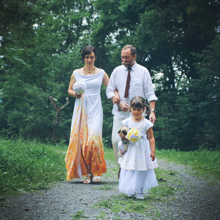 Tyto šaty byly navrženy přímo pro Kateřinu. Společně jsme vymyslely a posléze „dolaďovaly“ střih, vzor i barvy. Vznikly originální svatební šaty, které nevěstu krásně rozzářily.