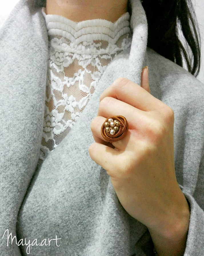 Drátováné prsten vyrobený z měděného drátu a perliček