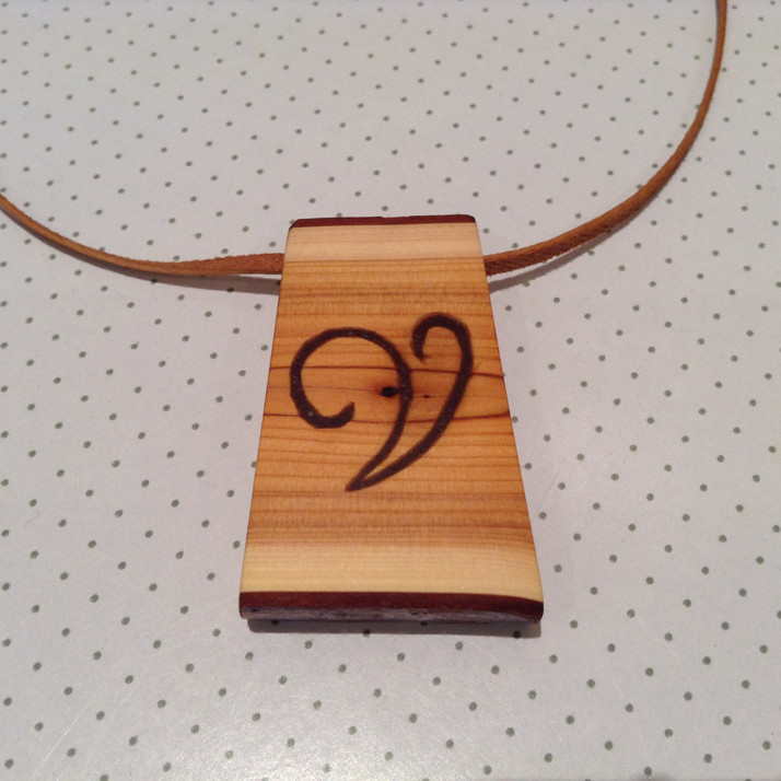 Do kousku tisu jsem vyřezal iniciálu a tu následně vyplnil drceným ametystem. Vybrousil do lesku a zavěsil na hnědou kůži a krk své ženy :-)