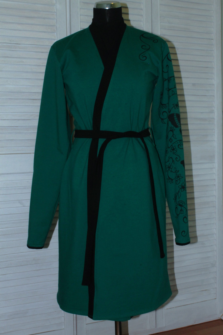 Dlouhá mikina ve stylu cardigan/kimono z teplákoviny, s malovaným rukávem (motivy květin a motýlů) na zakázku v černo-zelené barvě