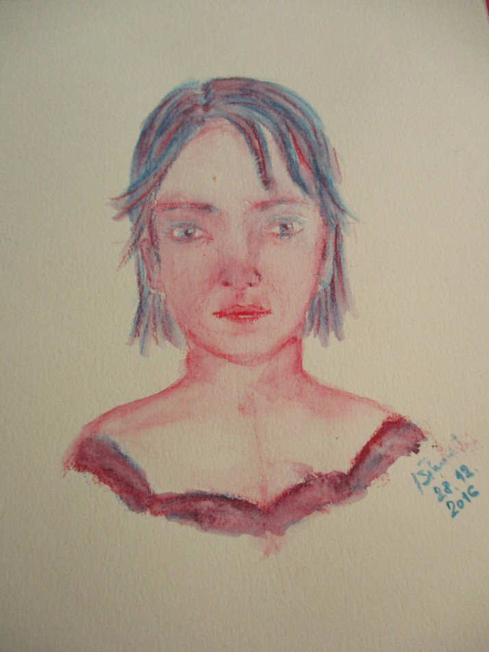 Pokus se dvěma akvarelovými pastelkami -červenou a modrou. Prvním průzkumem den předem jsem se přiklonila k méně modré, aby slečna nevypadala ušmudlaně
