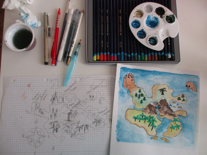 Večer před spaním jsem si načrtla plán ostrova na čtverečkový papír tužkou a druhý den jsem nápad přenesla na nějakou letitou dětskou čtvrtku - mimochodem tragickou (gumování bylo hned vidět, rozmytí to kroutilo... jak můžou nebohý děti ve škole kreslit vodovkama nechápu)
