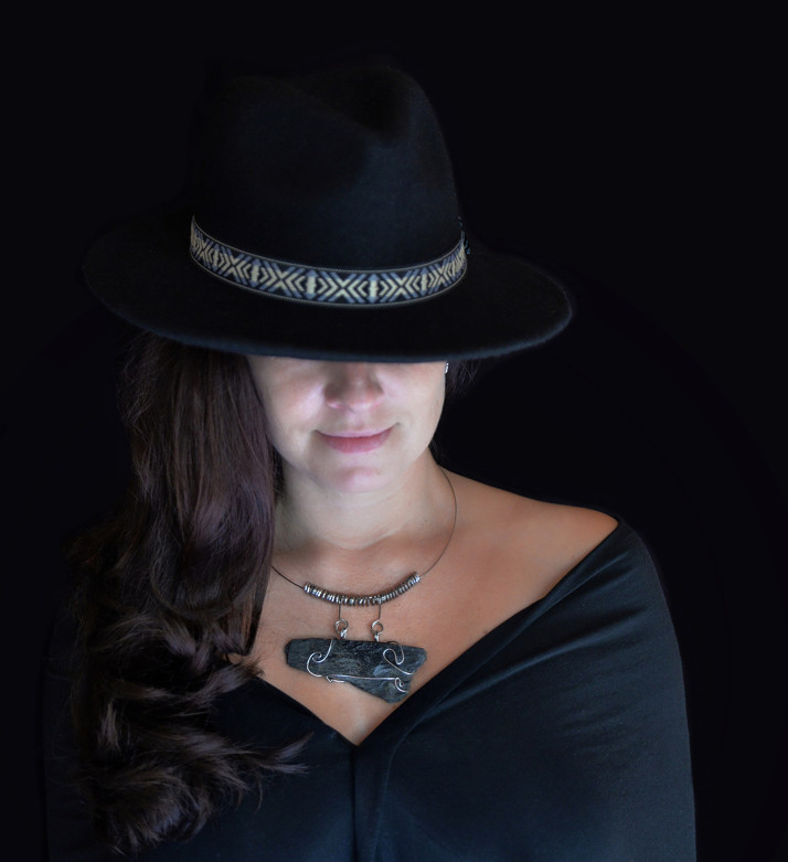 Další z řady drsných jesenických šperků, kombinace místního kamene - břidlice a tepané chirurgické oceli. Kov zde znázorňuje horské jesenické bystřiny - tedy element vody.