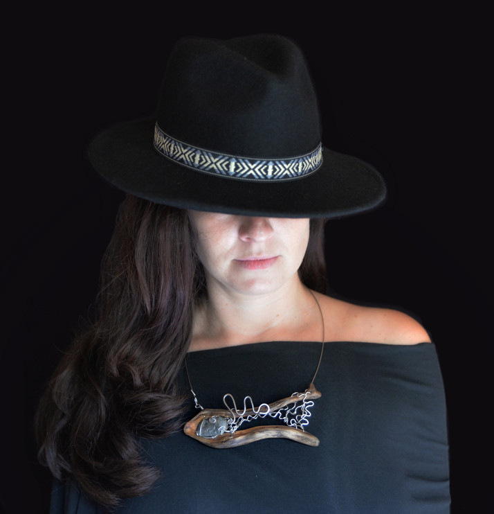 Velmi osobitý, extravagantní, přírodní šperk z řady drsných jesenických; břidlice z Jeseníku je vpletena pomocí tepaného drátu z chir.oceli do kousku klečového kořene.