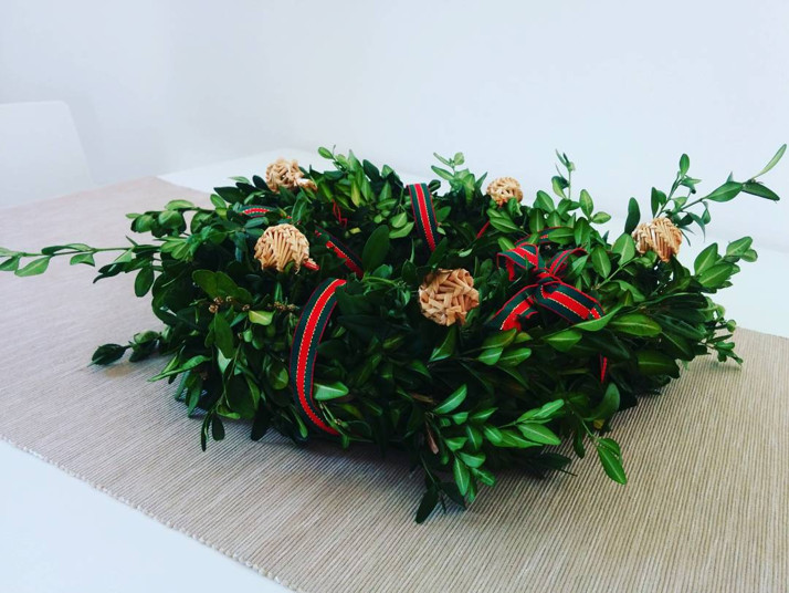 Věnec vyroben z buxusu dozdobený stužkou a slaměnými ozdobami.