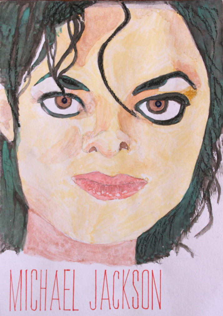 Obrázek malovaný vodovými barvami na papírové čtvrtce. Portrét slavného zpěváka Michaela Jacksona.