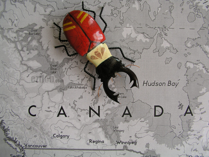 Brouk z entomologické kazety pro náčelníka policie v barvách slavné Royal Canadian Mounted Police. Vzorem byl roháč obecný (Lucanus cervus Linné, 1758), velikost cca 9 cm.