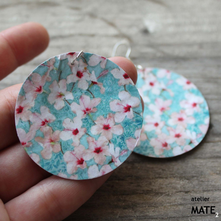 Náušnice jsou z perleťového kola o průměru 5cm. Kolo je upraveno technikou decoupage - OBOUSTRANNÁ DECOUPAGE. Perleť je opatřena lakem, který zajistí, že bude naušnice odolná proti poškrábání, dešti.... Použitý kov je stříbrné barvy. Háček je kovový bez obsahu niklu a olova. Celková délka i s háčkem je 6cm. Baleno v originální recy-cigaretové krabičce.