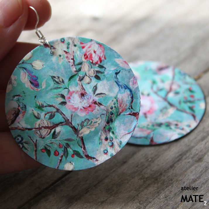 Náušnice jsou z perleťového kola o průměru 5cm. Kolo je upraveno technikou decoupage - OBOUSTRANNÁ DECOUPAGE. Perleť je opatřena lakem, který zajistí, že bude naušnice odolná proti poškrábání, dešti.... Použitý kov je stříbrné barvy. Háček je kovový bez obsahu niklu a olova. Celková délka i s háčkem je 6cm. Baleno v originální recy-cigaretové krabičce.