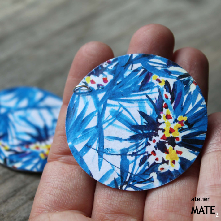 Náušnice jsou z perleťového kola o průměru 5cm. Kolo je upraveno technikou decoupage - OBOUSTRANNÁ DECOUPAGE. Perleť je opatřena lakem, který zajistí, že bude naušnice odolná proti poškrábání, dešti.... Použitý kov je stříbrné barvy. Háček je kovový bez obsahu niklu a olova. Celková délka i s háčkem je 6cm. Baleno v originální recy-cigaretové krabičce.