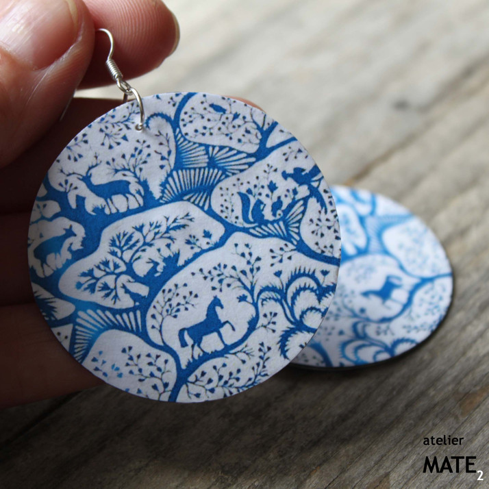 Náušnice jsou z perleťového kola o průměru 5cm. Kolo je upraveno technikou decoupage - OBOUSTRANNÁ DECOUPAGE. Perleť je opatřena lakem, který zajistí, že bude naušnice odolná proti poškrábání, dešti.... Použitý kov je stříbrné barvy. Háček je kovový bez obsahu niklu a olova. Celková délka i s háčkem je 6cm. Baleno v originální recy-cigaretové krabičce.