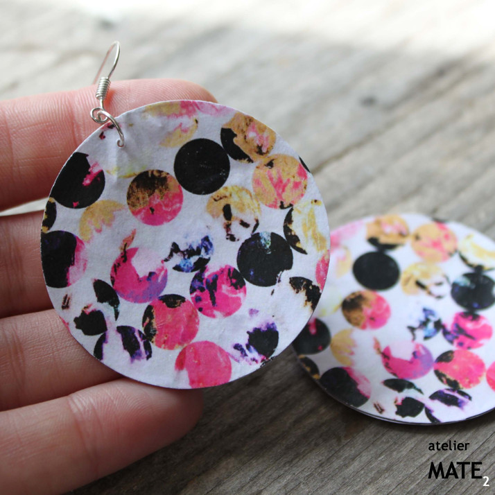 Náušnice jsou z perleťového kola o průměru 5cm. Kolo je upraveno technikou decoupage - OBOUSTRANNÁ DECOUPAGE. Perleť je opatřena lakem, který zajistí, že bude naušnice odolná proti poškrábání, dešti.... Použitý kov je stříbrné barvy. Háček je kovový bez obsahu niklu a olova. Celková délka i s háčkem je 6cm. Baleno v originální recy-cigaretové krabičce.