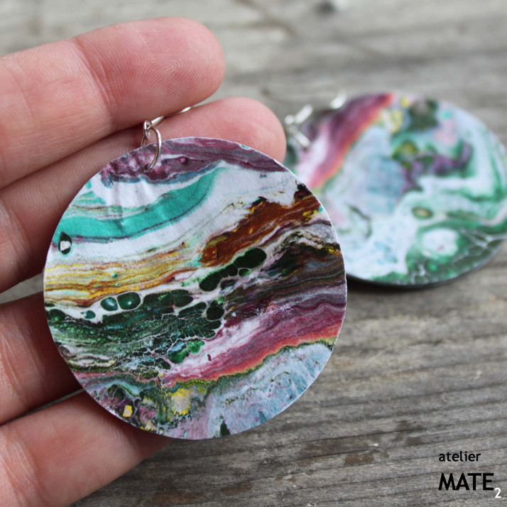 Náušnice jsou z perleťového kola o průměru 5cm. Kolo je upraveno technikou decoupage - OBOUSTRANNÁ DECOUPAGE. Perleť je opatřena lakem, který zajistí, že bude naušnice odolná proti poškrábání, dešti.... Použitý kov je stříbrné barvy. Háček je kovový bez obsahu niklu a olova. Celková délka i s háčkem je 6cm. Baleno v originální recy-cigaretové krabičce.