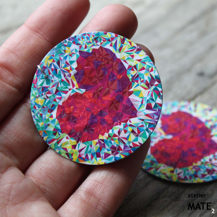 Náušnice jsou z perleťového kola o průměru 5cm. Kolo je upraveno technikou decoupage - OBOUSTRANNÁ DECOUPAGE. Perleť je opatřena lakem, který zajistí, že bude naušnice odolná proti poškrábání, dešti.... Použitý kov je stříbrné barvy. Háček je kovový bez obsahu niklu a olova. Celková délka i s háčkem je 6cm. Baleno v originální recy-cigaretové krabičce.