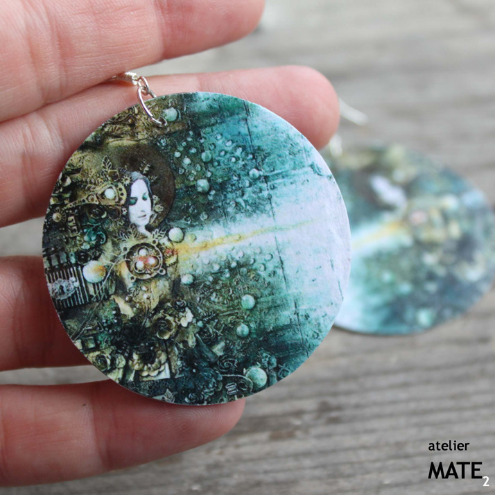 Náušnice jsou z perleťového kola o průměru 5cm. Kolo je upraveno technikou decoupage - OBOUSTRANNÁ DECOUPAGE. Perleť je opatřena lakem, který zajistí, že bude naušnice odolná proti poškrábání, dešti.... Použitý kov je stříbrné barvy. Háček je kovový bez obsahu niklu a olova. Celková délka i s háčkem je 6cm. Baleno v originální recy-cigaretové krabičce.