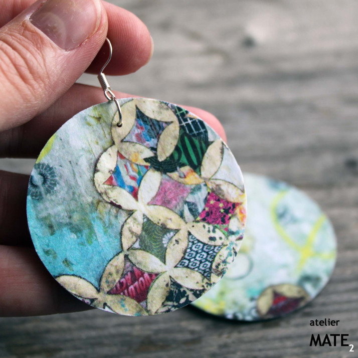 Náušnice jsou z perleťového kola o průměru 5cm. Kolo je upraveno technikou decoupage - OBOUSTRANNÁ DECOUPAGE. Perleť je opatřena lakem, který zajistí, že bude naušnice odolná proti poškrábání, dešti.... Použitý kov je stříbrné barvy. Háček je kovový bez obsahu niklu a olova. Celková délka i s háčkem je 6cm. Baleno v originální recy-cigaretové krabičce.