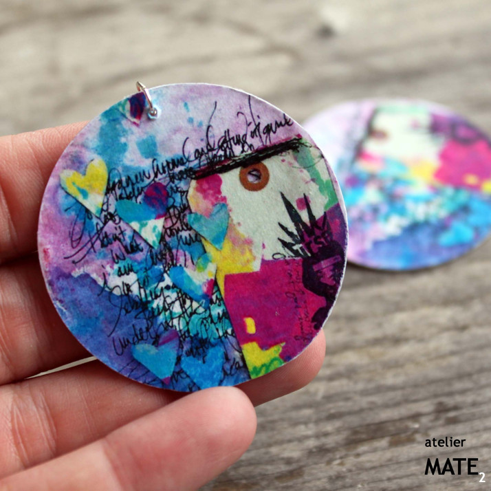 Náušnice jsou z perleťového kola o průměru 5cm. Kolo je upraveno technikou decoupage - OBOUSTRANNÁ DECOUPAGE. Perleť je opatřena lakem, který zajistí, že bude naušnice odolná proti poškrábání, dešti.... Použitý kov je stříbrné barvy. Háček je kovový bez obsahu niklu a olova. Celková délka i s háčkem je 6cm. Baleno v originální recy-cigaretové krabičce.