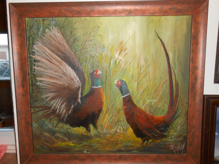 Krásnývelký obraz bažantů připravujících se k boji -olej.