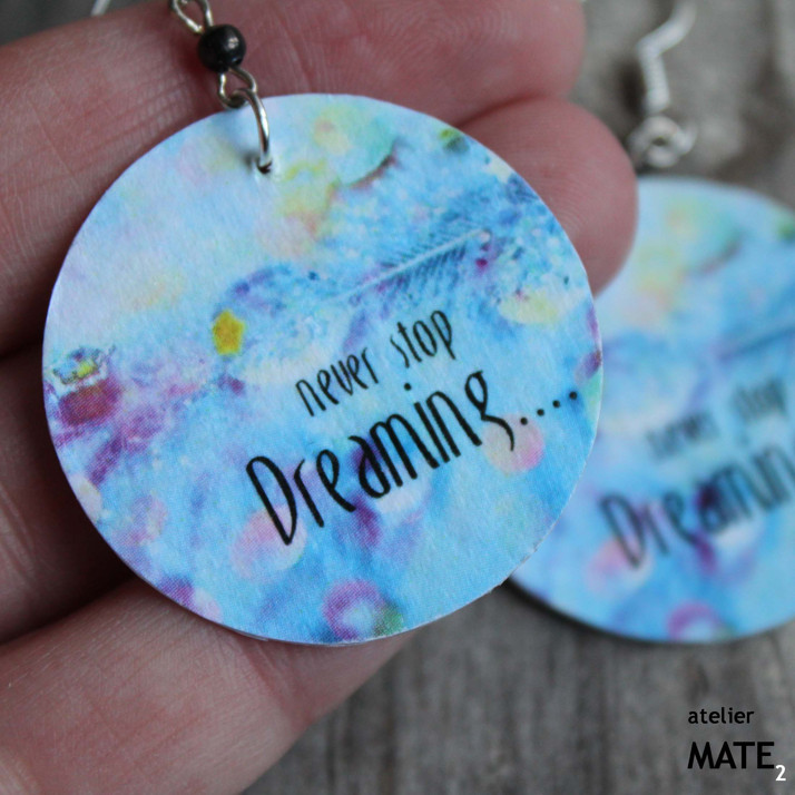 Náušnice jsou z perleťového kola o průměru 3,5cm. Kolo je upraveno technikou decoupage - OBOUSTRANNÁ DECOUPAGE. Perleť je opatřena lakem, který zajistí, že bude naušnice odolná proti poškrábání, dešti.... Použitý kov je stříbrné barvy. Háček je kovový bez obsahu niklu a olova. Celková délka i s háčkem je 5cm. Baleno v originální recy-cigaretové krabičce.