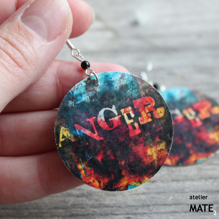 Náušnice jsou z perleťového kola o průměru 4cm. Kolo je upraveno technikou decoupage - OBOUSTRANNÁ DECOUPAGE. Perleť je opatřena lakem, který zajistí, že bude naušnice odolná proti poškrábání, dešti.... Použitý kov je stříbrné barvy. Háček je kovový bez obsahu niklu a olova. Celková délka i s háčkem je 5,5cm. Baleno v originální recy-cigaretové krabičce.