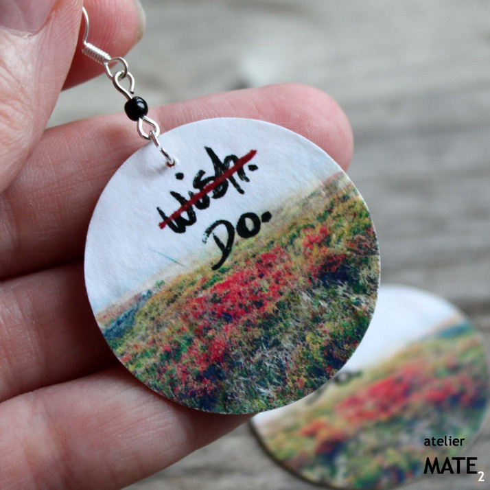 Náušnice jsou z perleťového kola o průměru 4cm. Kolo je upraveno technikou decoupage - OBOUSTRANNÁ DECOUPAGE. Perleť je opatřena lakem, který zajistí, že bude naušnice odolná proti poškrábání, dešti.... Použitý kov je stříbrné barvy. Háček je kovový bez obsahu niklu a olova. Celková délka i s háčkem je 5,5cm. Baleno v originální recy-cigaretové krabičce.