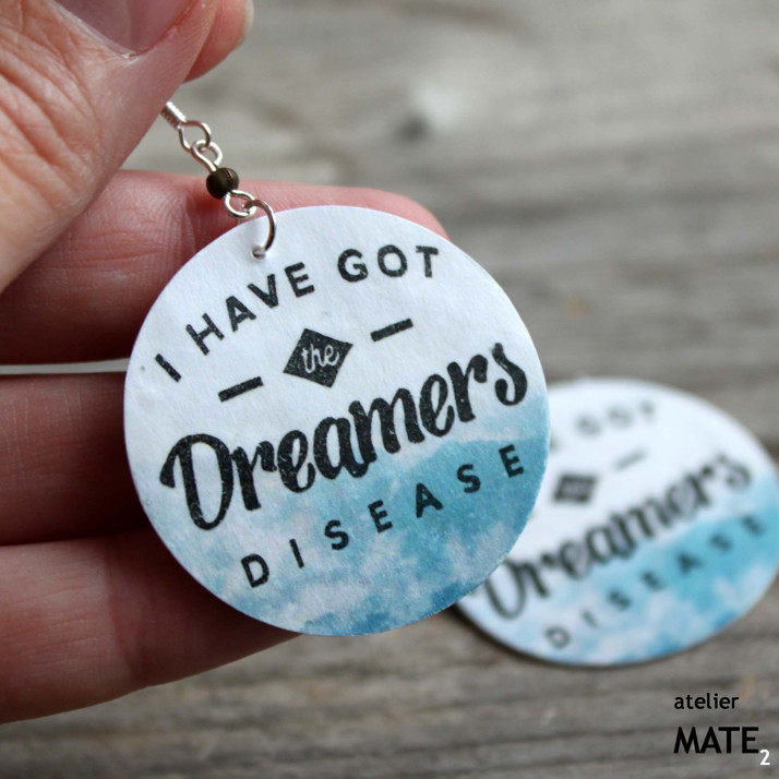 Náušnice jsou z perleťového kola o průměru 4cm. Kolo je upraveno technikou decoupage - OBOUSTRANNÁ DECOUPAGE. Perleť je opatřena lakem, který zajistí, že bude naušnice odolná proti poškrábání, dešti.... Použitý kov je stříbrné barvy. Háček je kovový bez obsahu niklu a olova. Celková délka i s háčkem je 5,5cm. Baleno v originální recy-cigaretové krabičce.