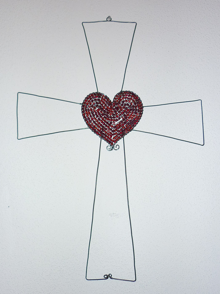 Kříž z černého drátu a výrazným srdcem vypleteným rudým rokailem české výroby. Moje přispění do nově zrekonstruované besídky.