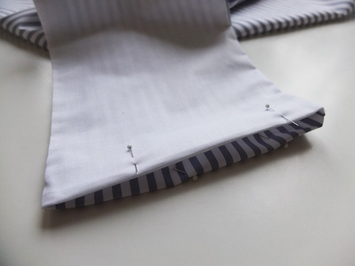 Sešpendlíme a sešijeme. Pozor, musí se šít jako rukáv = nesešít otvor.