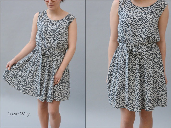 Šaty z potištěného hedvábného ponžé, v pase zřasené gumičkou a s vázačkou. Šity na přání.