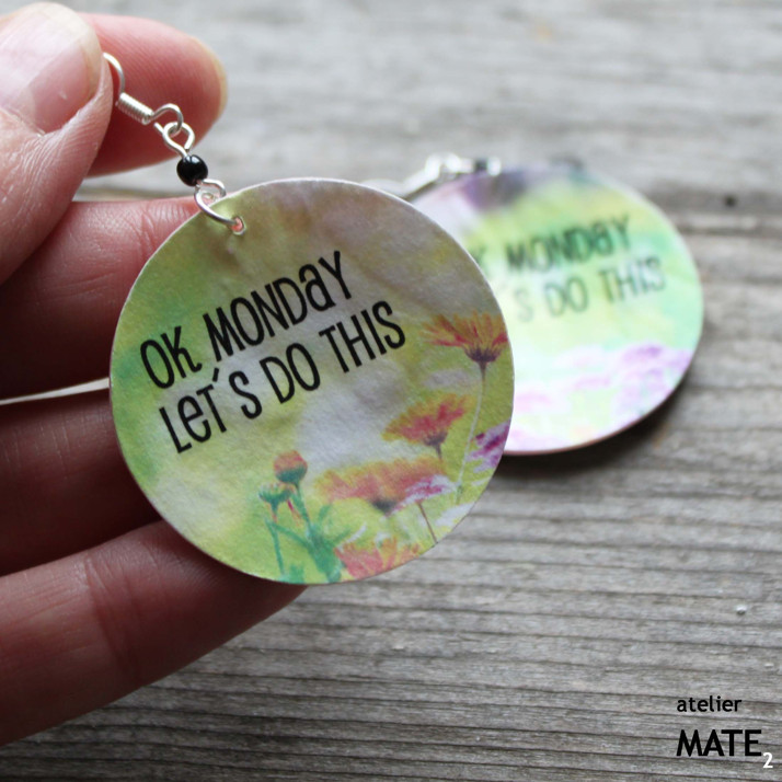 Náušnice jsou z perleťového kola o průměru 4cm. Kolo je upraveno technikou decoupage - OBOUSTRANNÁ DECOUPAGE. Perleť je opatřena lakem, který zajistí, že bude naušnice odolná proti poškrábání, dešti.... Použitý kov je stříbrné barvy. Háček je kovový bez obsahu niklu a olova. Celková délka i s háčkem je 5,5cm. Baleno v originální recy-cigaretové krabičce.
